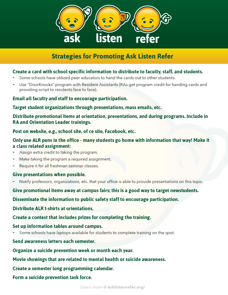 ALR currently serves 50 campuses across the state of Missouri and 15 out of state schools. Visit asklistenrefer.org and click on your campus to take the training! For questions email muwrcasklistenrefer@missouri.edu.