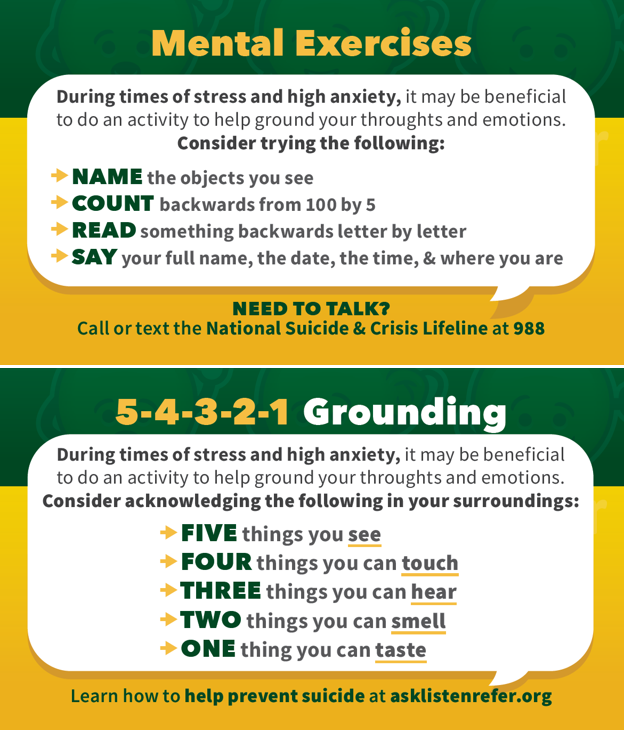 - 988 Suicide & Crisis Lifeline: Call or text 988 or chat online at chat.988lifeline.org/