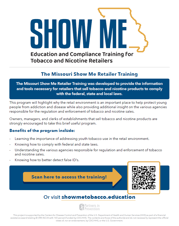 • The Missouri Show Me Retailer Training was developed to provide the information and tools necessary for retailers that sell tobacco and nicotine products to comply with the federal, state, and local laws.