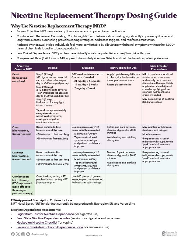 - This brand-new resource that has been created by Dr. Jenna Wintemberg. She created a nicotine replacement therapy dosing guide that can be used to help determine nicotine replacement therapy needs based upon clients’ reported nicotine usage. We hope that this will be helpful to have in the moment as you have conversations with students who might be interested in learning more about reducing use or quitting. Please feel free to print and share!